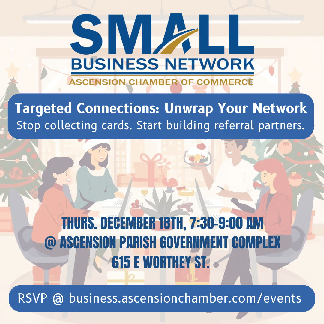 Targeted Connections: Unwrap Your Network Stop collecting cards. Start building referral partners. Join us for our December Small Business Network event, This structured networking event is designed to move beyond generic small talk. Utilizing our custom Referral Readiness Sheet, you will engage in guided, quick sessions focused exclusively on identifying ideal client profiles, core problems solved, and specific referral triggers for your peers. Leave with a roster of actionable relationships and a clear roadmap for reciprocal success in the new year.